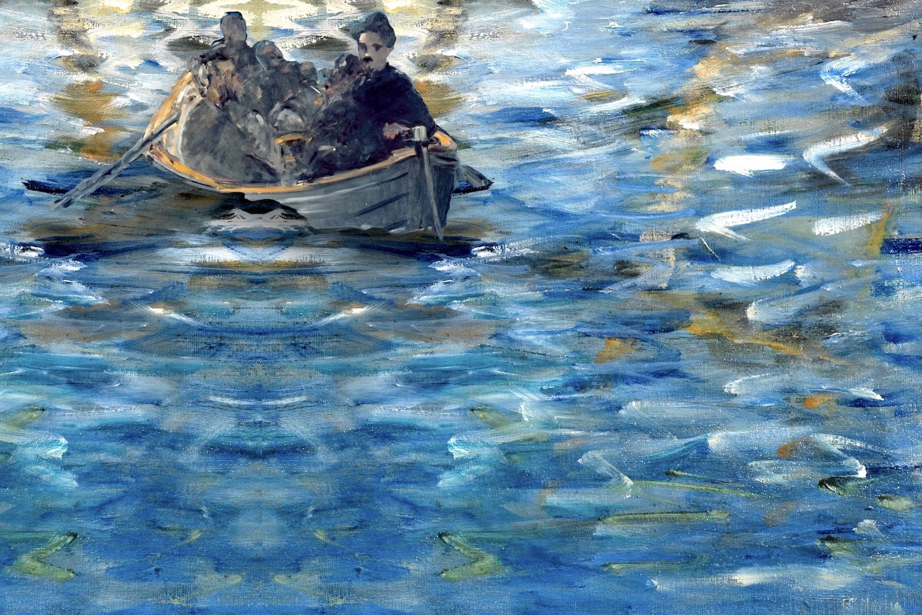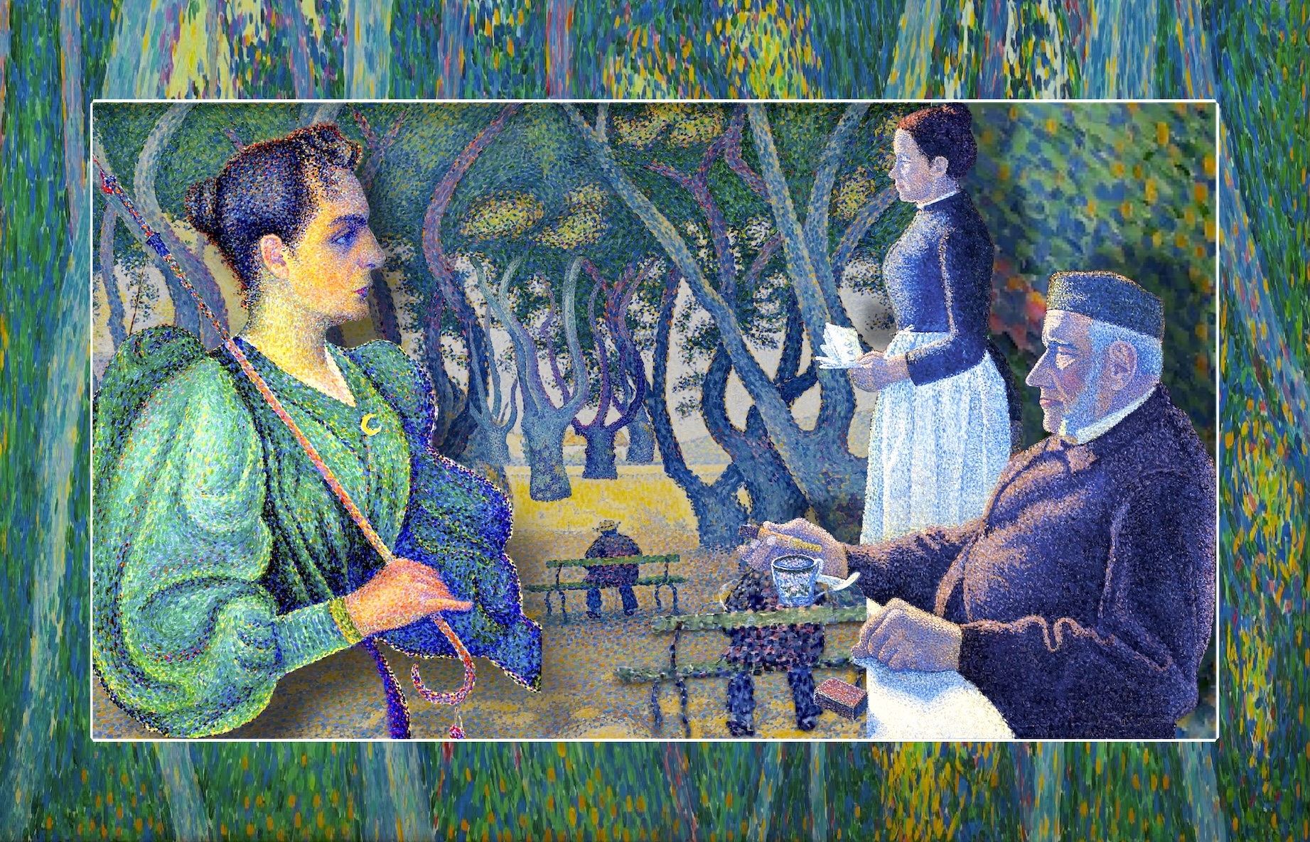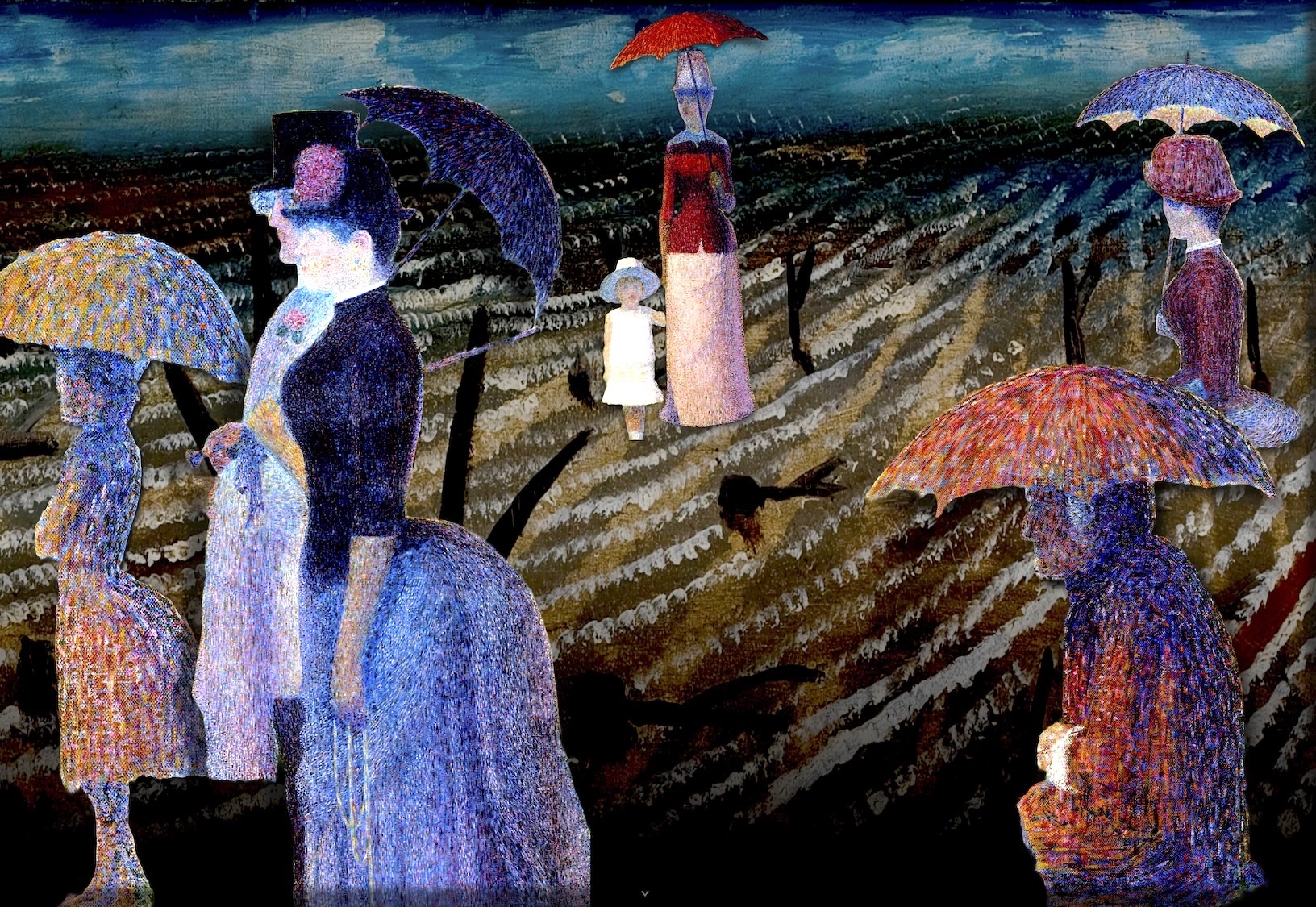 Nel suo dipinto più noto, "La Grande Jatte", l'artista francese Georges Seurat (1859/1891) ritraeva delle persone che si rilassavano in un parco su sull'isola della Senna. Nel nostro collage, abbiamo immaginato che i protagonisti principali del quadro originario si ritrovassero in campagna, sotto le prime piogge autunnali.