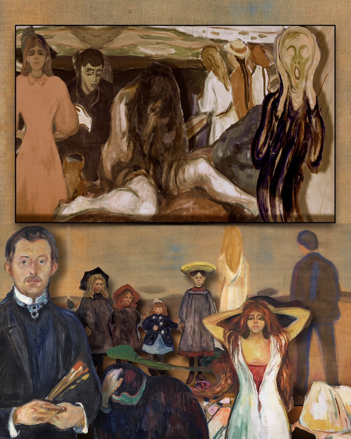 La vita di un artista è spesso caratterizzata da uno sguardo dualistico sulla realtà, capace di catturare luci intense e ombre profonde. Edvard Munch, il grande pittore norvegese (1863 - 1944), è considerato uno dei precursori dell'espressionismo e ha avuto un ruolo fondamentale nell'evoluzione dell'arte moderna. Nel nostro collage Edvard Munch appare in basso a sinistra in uno dei suoi autoritratti, mentre in alto a destra possiamo ancora vederlo, in uno dei suoi momenti di panico, nel suo dipinto più iconicamente famoso: l'Urlo.