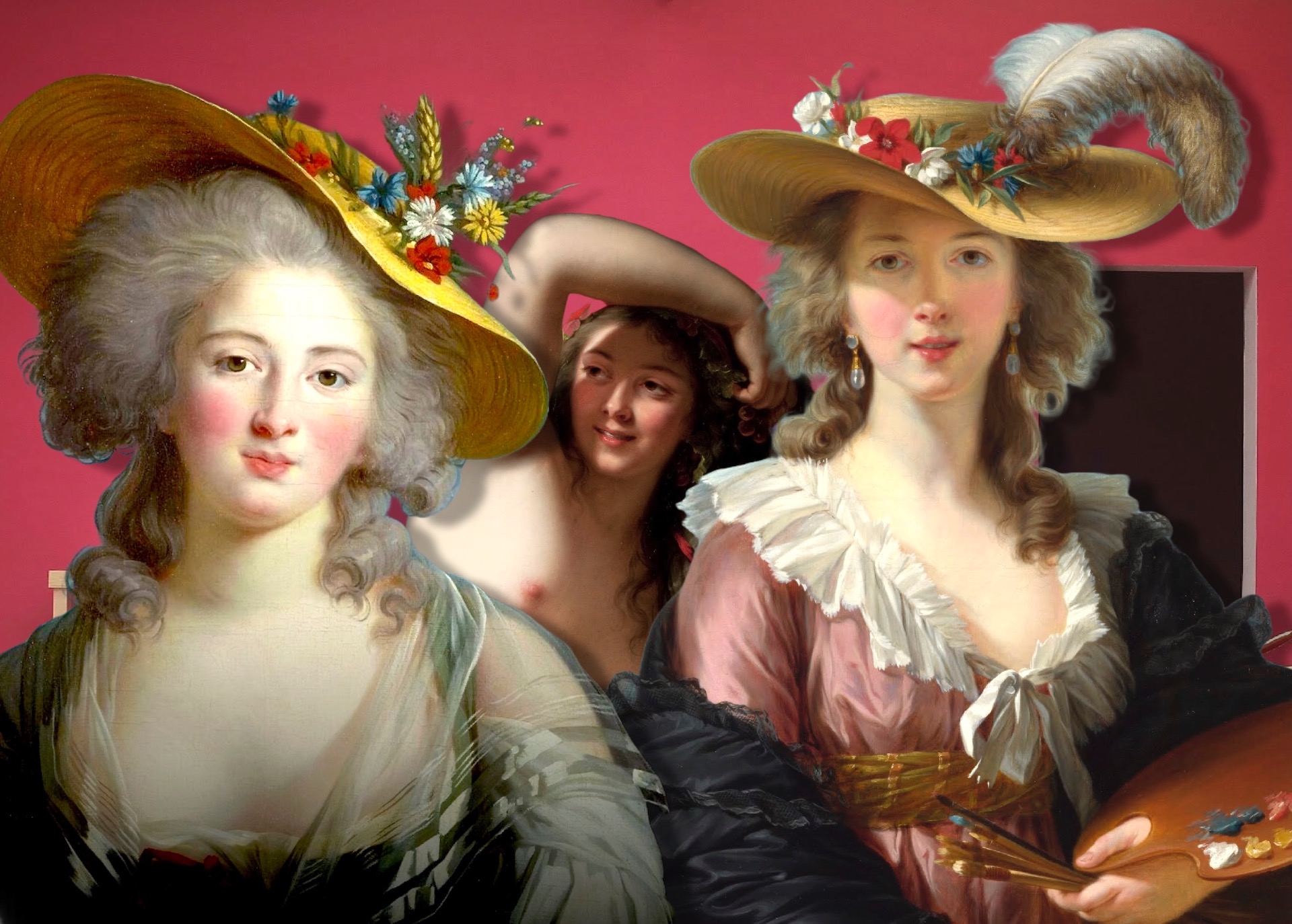 Élisabeth-Louise Vigée (1755/1842), maritata Le Brun, si affermò alla corte di Maria Antonietta, ritratta in ben trenta quadri che l'artista dipinse. Nel collage, la pittrice appare a destra e la regina a sinistra, nel ritratto datato 1782. Maria Antonietta indossa un semplice abito di mussola che fece scalpore per la sua informalità.